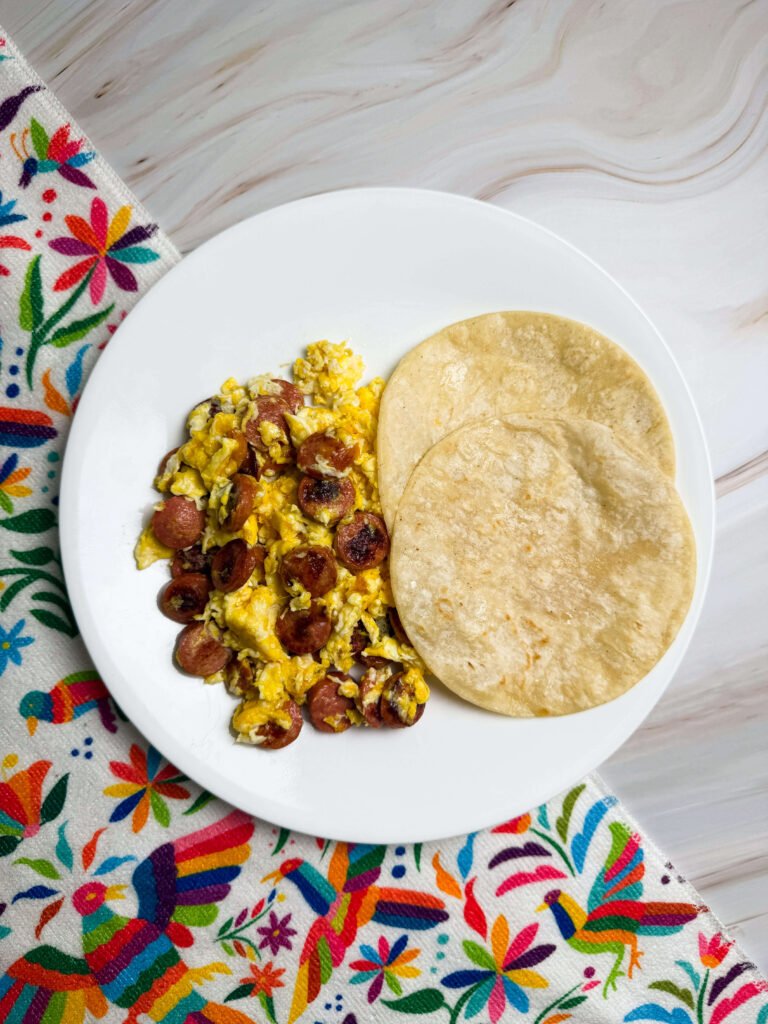 Growing up, weenie con huevo was one of those breakfasts my Mom resorted to on busy mornings. It’s made with hot dogs sliced into coins and eggs scrambled right into the same pan. It’s a super quick recipe that’s ready to go in 5 minutes. It wasn’t fancy. It didn’t need to be. It was warm, filling, and tasted like home.